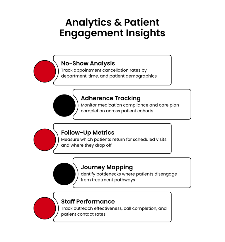 Dashboards that show what matters: no-show rates, follow-up completion, medication adherence.