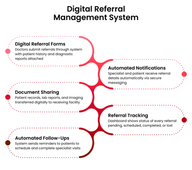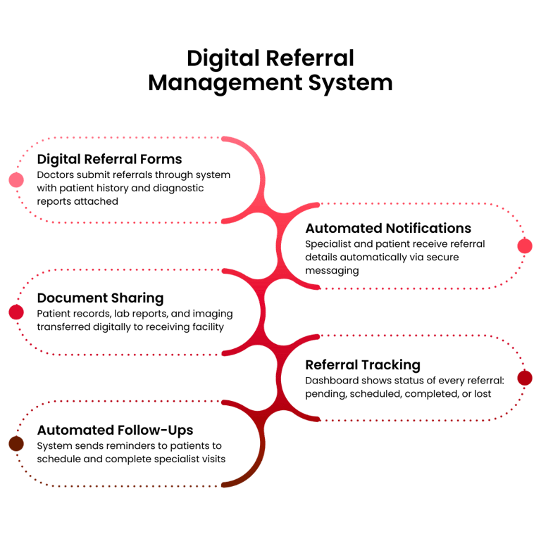 100% referral visibility. 60% higher completion rates. Specialists receive patient records in advance. No more notebook tracking.