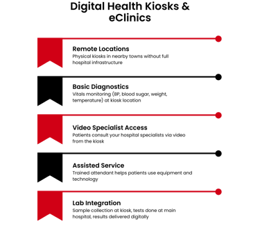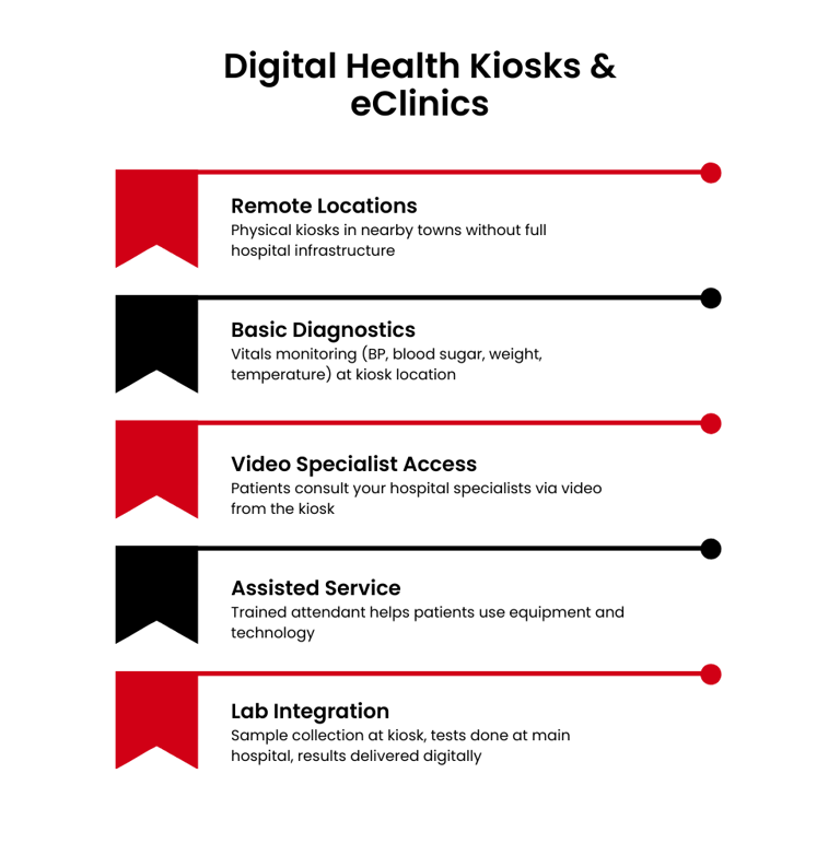 Tele-consultation, health kiosks, and digital referral networks extend your reach.
