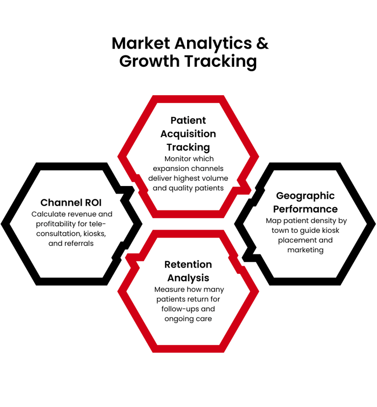 We deploy analytics to track patient acquisition sources, retention rates, and geographic expansion performance.