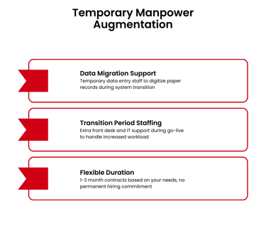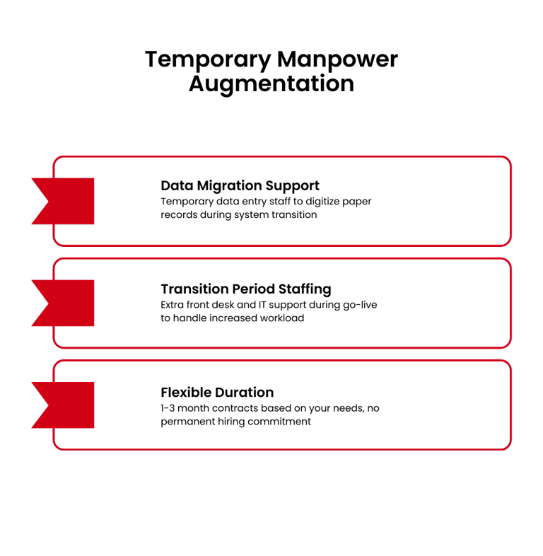 Operations continue smoothly during transitions. Permanent staff not overwhelmed. Clean data migration. Buffer capacity when you need it most.