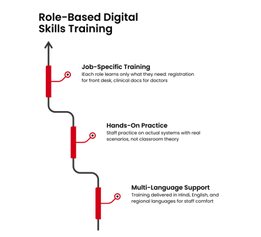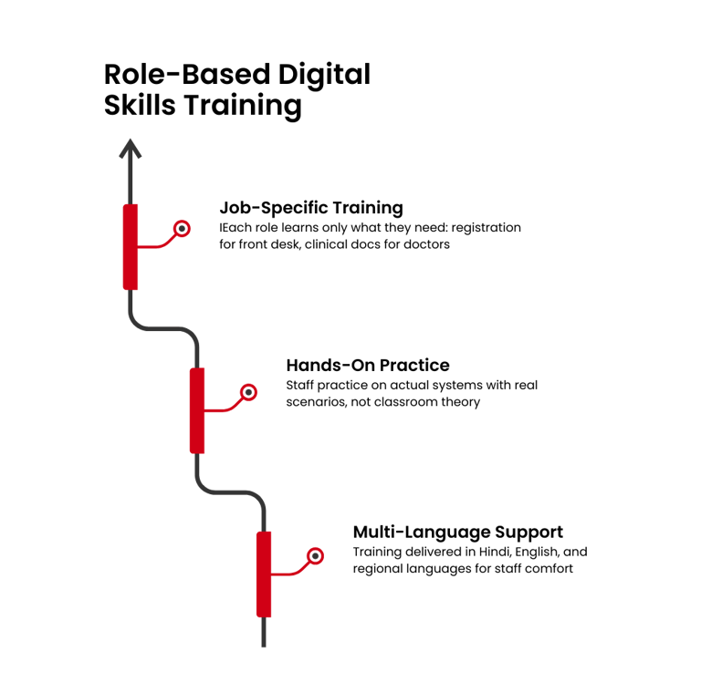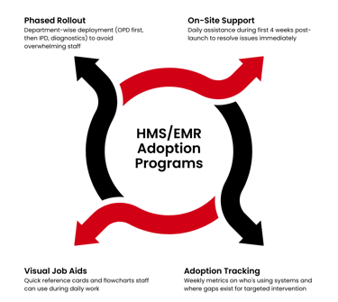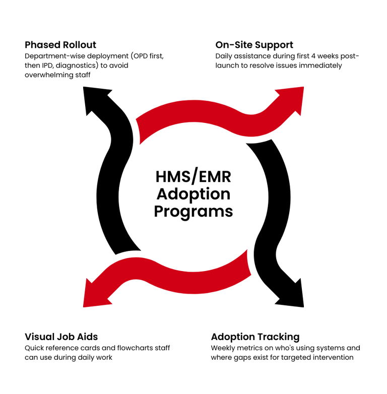 We run structured adoption programs that move your hospital from paper-based to digital operations systematically.