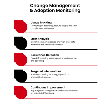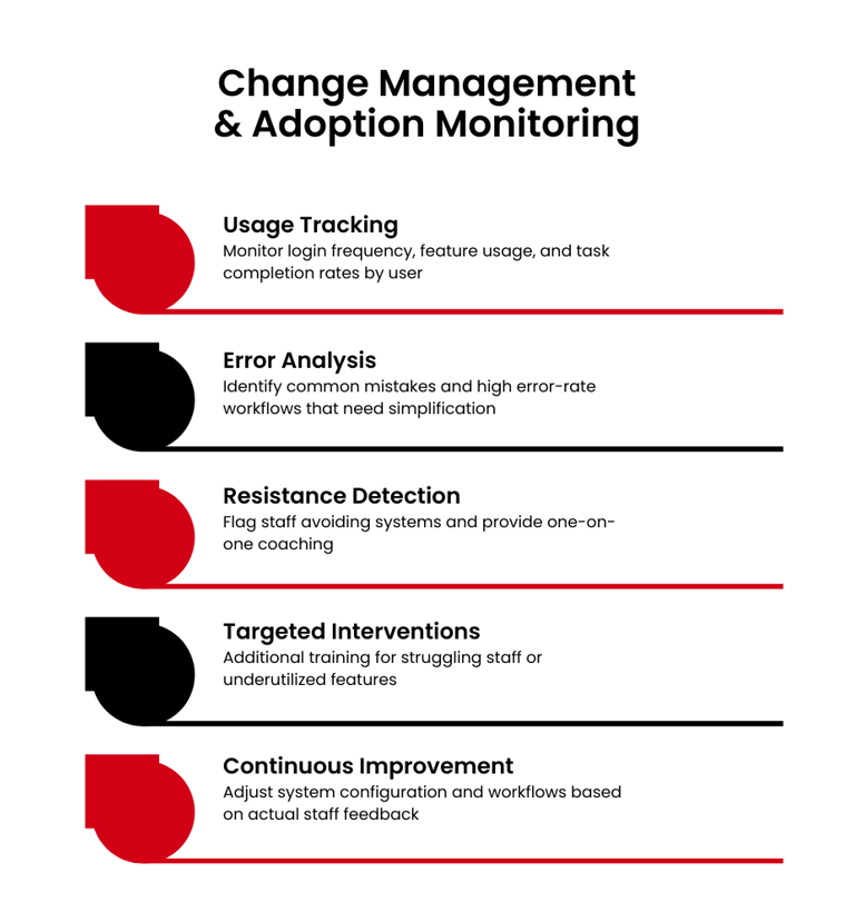 We monitor system usage and provide targeted interventions to ensure adoption doesn't drop after initial launch excitement.