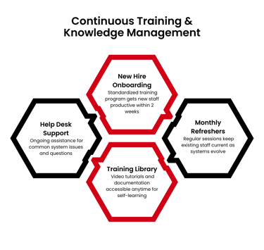 New staff productive within 2 weeks instead of 2 months. Consistent knowledge across team despite turnover. Staff confidence in using systems. Reduced help desk tickets over time.